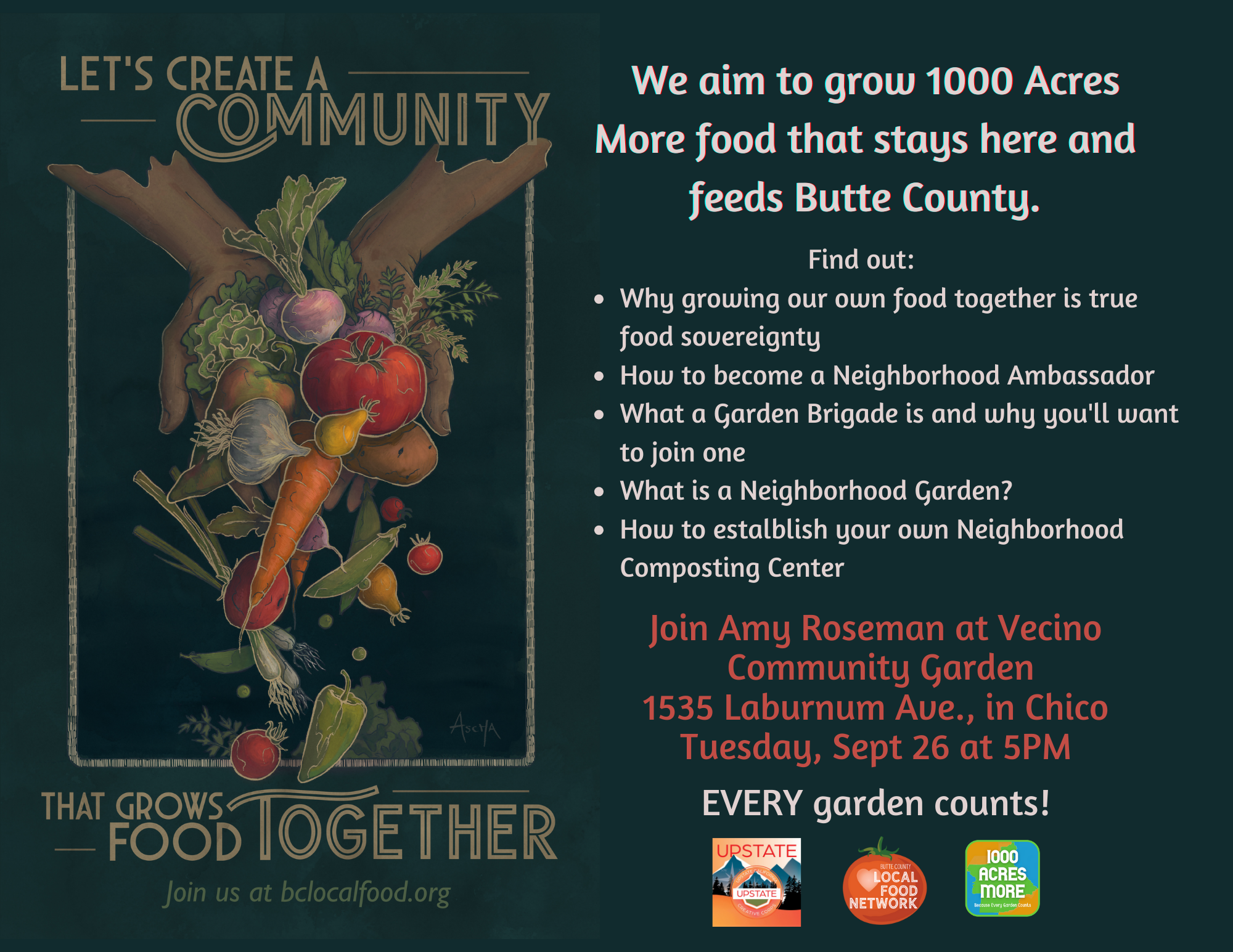 1000 Acres More Project Talk with Amy Roseman Tuesday, September 26, 2023 5:00 PM 6:00 PM 1535 Laburnum Ave Chico, CA 95926 United States (map) Google Calendar ICS Amy Roseman will be talking about why local food is important and how we can all come together in community to create grow 1000 Acres More food that stays here locally.