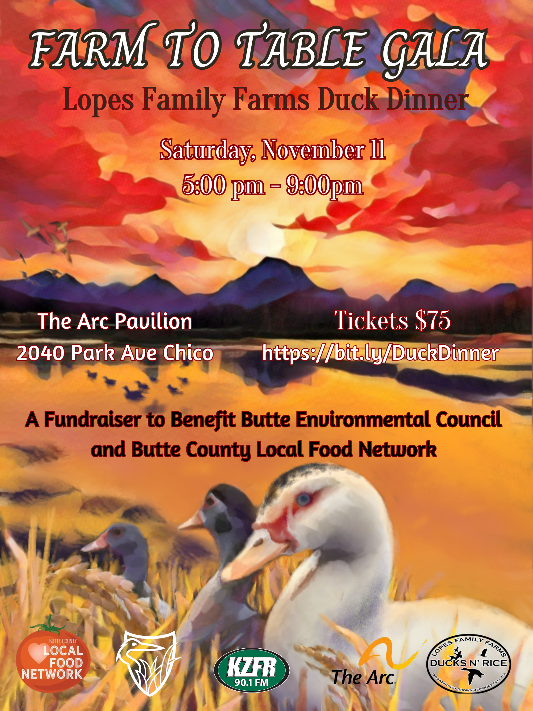 Butte County Local Food Network together with Butte Environmental Council is having a fabulous 6 course Duck Dinner put together with Love and Magic by Chef Alex Cilensek and Donna Garrison. Featuring Organically raised Muscovy duck from the Lopes Family Farms in Princeton. Muscovy meat is one of the healthiest meats on the market today, being 98 percent or greater fat-free. The meat is not only great tasting but very nutritious. And, being so lean, meat from the Muscovy duck is not greasy as is the case with some other duck meat. We will be using the whole duck for the five way servings.